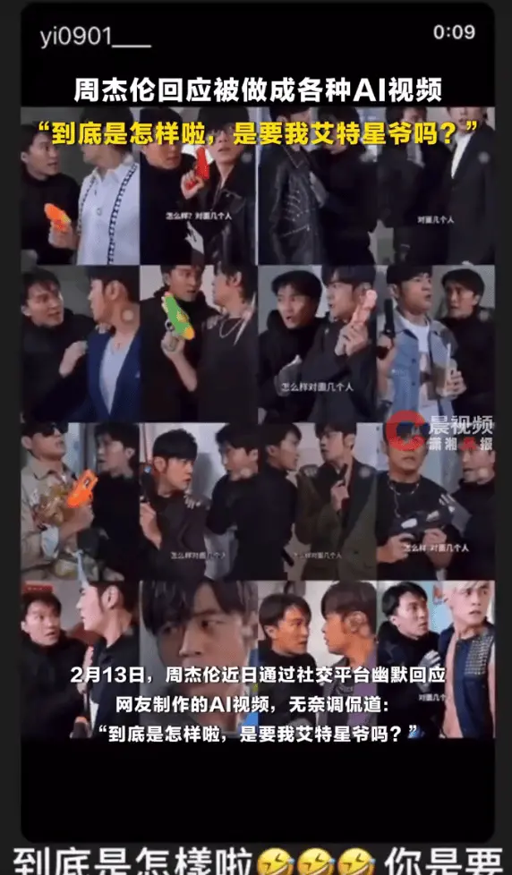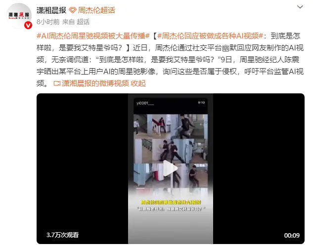 与此同时,周星驰方面也对AI视频现象发声。9日,其经纪人陈震宇晒出某平台用户利用AI生成的周星驰影像,并质疑此举是否构成侵权,呼吁平台对相关AI视频内容加强监管。