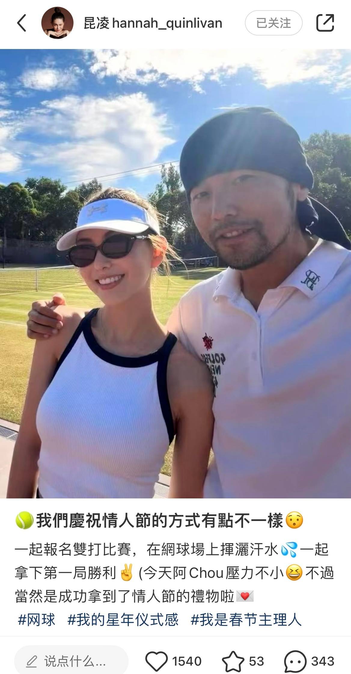 2月14日情人节,昆凌在社交平台上晒出与老公周杰伦的合照,并配文称:“我们庆祝情人节的方式有点不一样,一起报名双打比赛,在网球场上挥洒汗水,一起拿下第一局胜利。(今天阿Chou压力不小,不过当然是成功拿到了情人节的礼物啦!)”