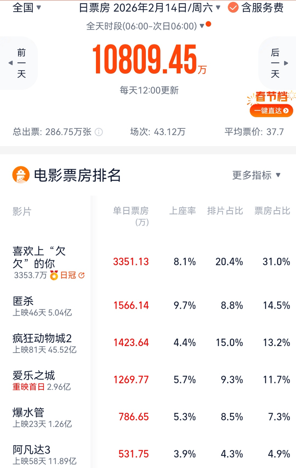 2月14日情人节,《匿杀》《疯狂动物城2》排在日榜第二、第三,单日票房分别为1566万元、1424万元。
