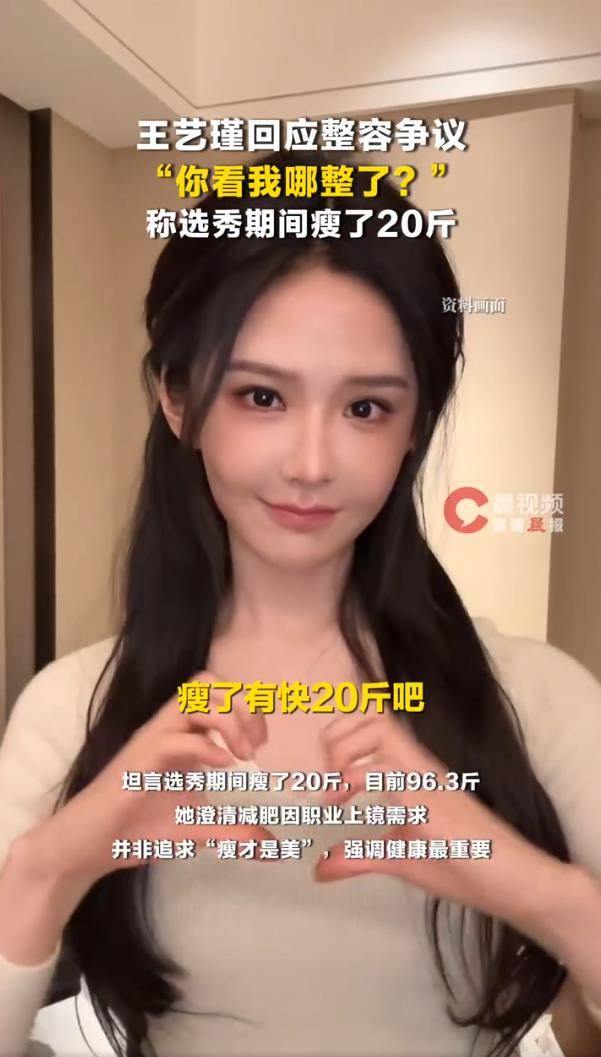 正是这些对比图,将王艺瑾送上了舆论的风口浪尖。于是,在次日的直播中,她选择了直接回应。面对镜头,她笑着反问“你看我哪整了?”,以此明确否认了整容传闻。她将一切变化归结于长达五年的自律:为了职业上镜需求,累计减重近20斤,目前体重维持在96.3斤。她坦言,如果不是因为镜头会把人拉宽,自己“根本不会减肥”,并旗帜鲜明地反对“瘦才是美”的观念,强调健康最重要。