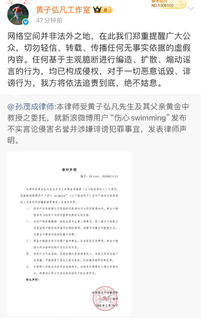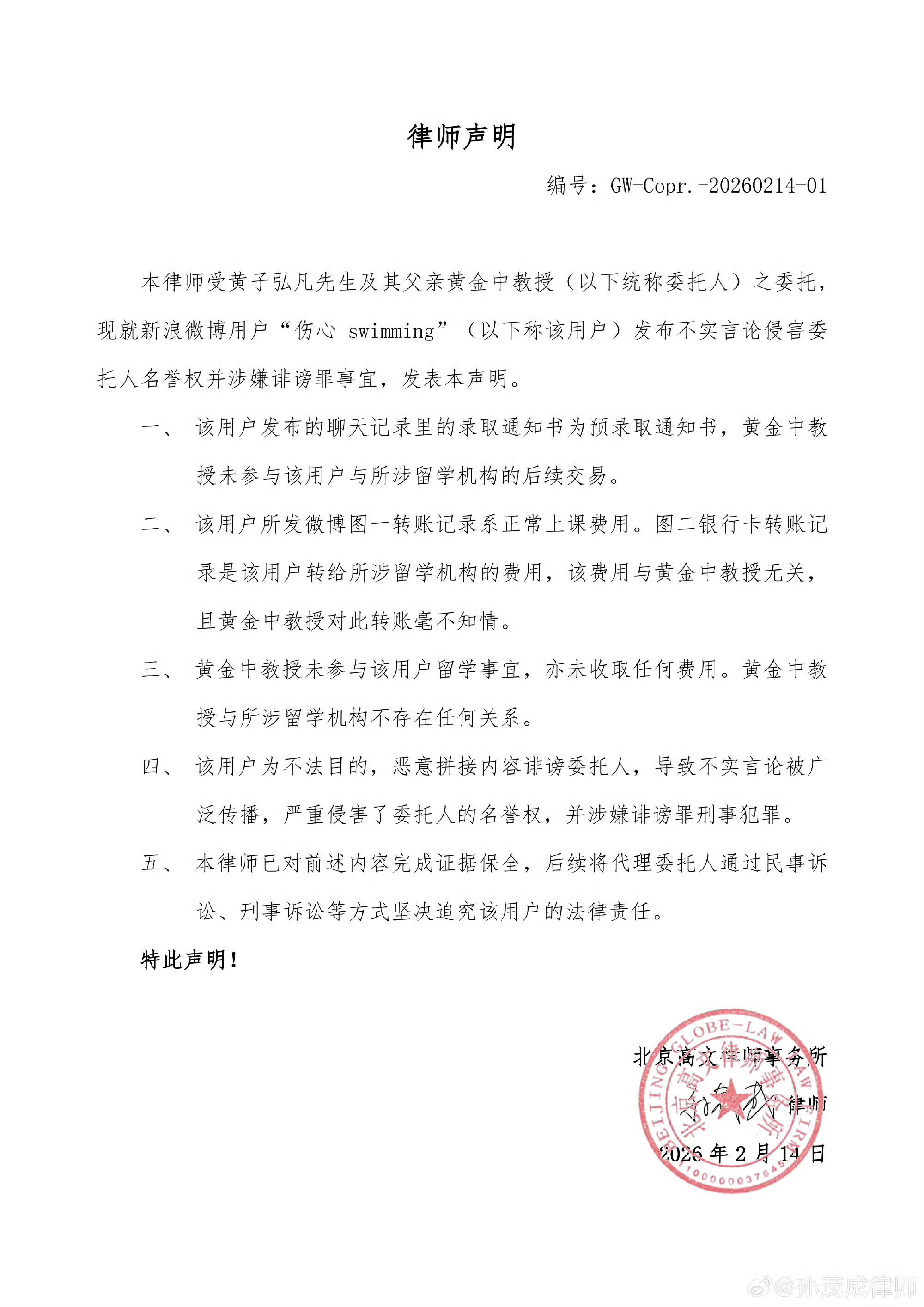 然而,工作室的后续动作比预想的更为迅猛。2月15日,即声明发布次日,工作室便委托律师正式对爆料网友“伤心swimming”提起了诉讼。随律师声明一同公布的,还有对指控关键点的逐条驳斥:首先,网友晒出的“录取通知书”被指实为常见的预录取通知,并非保证入学的正式文件;其次,两笔共计6.4万元的转账,一笔被解释为正常的课程学费,另一笔则是支付给第三方留学机构的服务费,均声明与黄金中本人无关;最后,工作室坚决否认黄金中参与该网友的留学事宜、收取任何费用,并切割其与涉事机构的所有关联。声明最终将“伤心swimming”的行为定性为“为不法目的恶意拼接内容”,不仅侵害名誉权,更涉嫌诽谤刑事犯罪,法律程序已然启动。