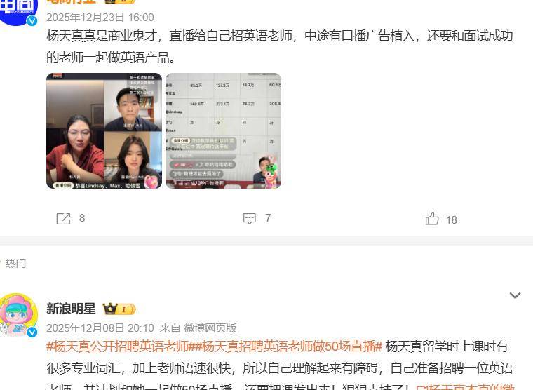 一个月前,杨天真还在网上大张旗鼓给自己招英语老师,表面上还挺上进的,可有网友看了直播视频之后,才意识到她不是真的招老师,更像是卖货之前做个铺垫,面试直播都要挂广告链接。