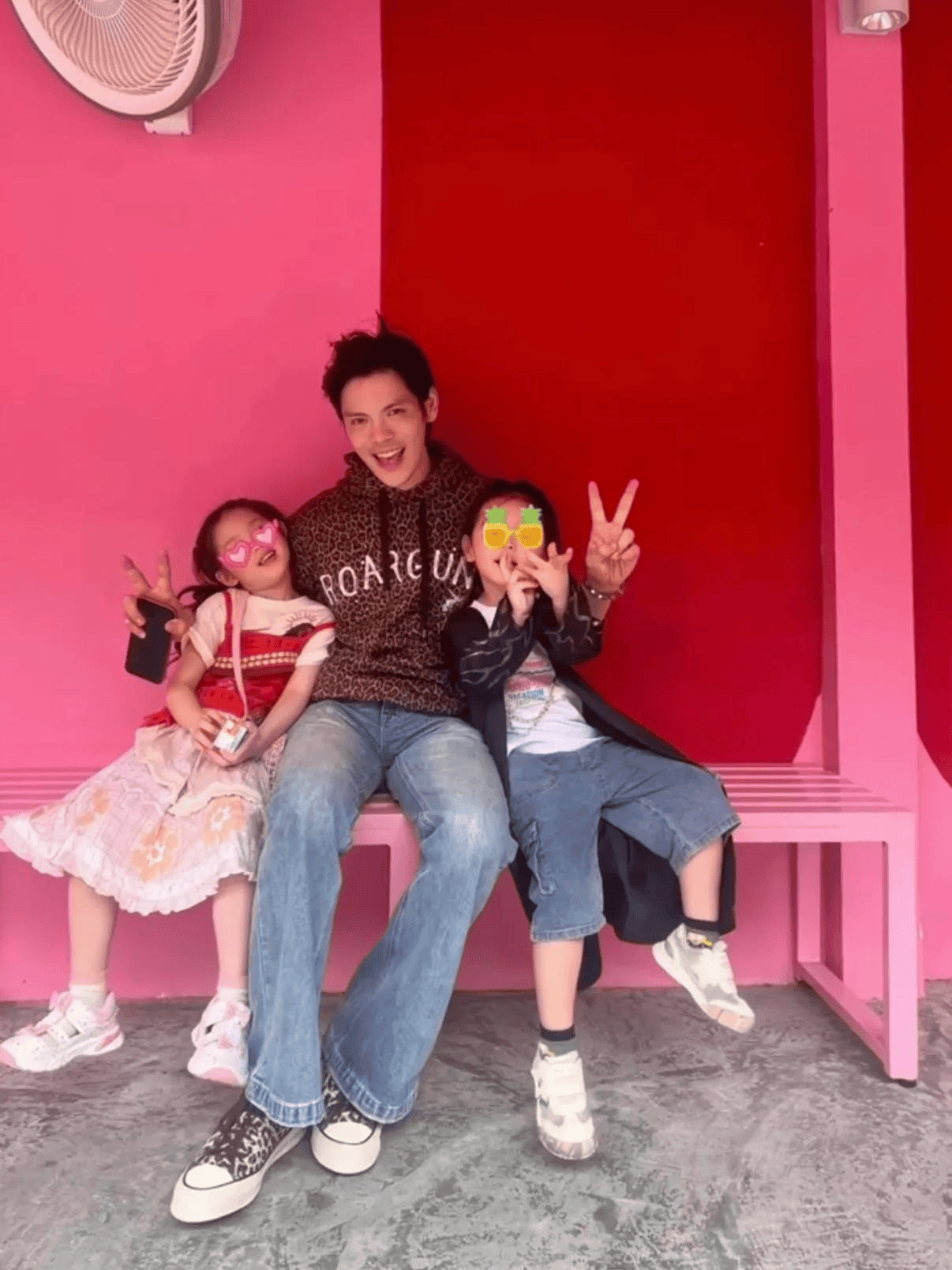 2月14日情人节,向佐在社交平台分享了他们全家出游的照片。画面里,一家四口站在粉色背景前合影,表情放松,气氛温暖,既有节日的甜意,也有家庭的亲近感。向佐穿着豹纹图案上衣配牛仔