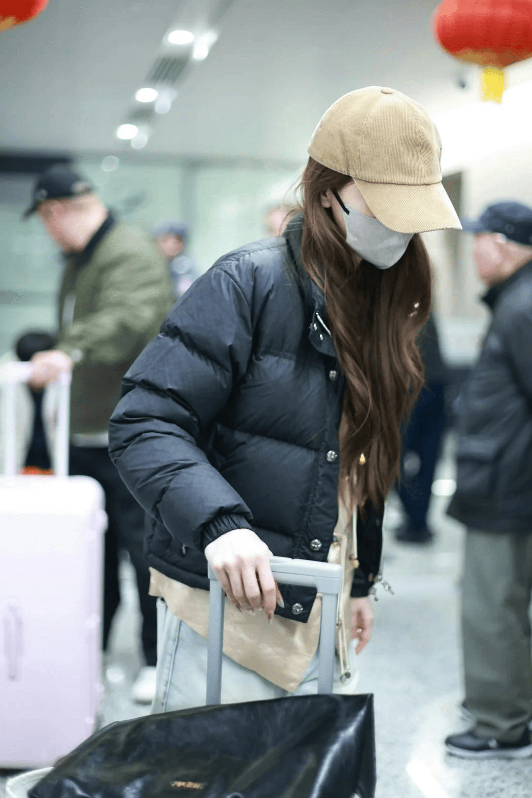 这次返沪,她穿了一件黑色厚羽绒服,配一条宽松牛仔裤,里面搭着简单的内衬,全身的搭配以舒适为主。整个人显得非常瘦,身形单薄,但步伐很快。没有化精致妆容,素颜配口罩和帽子,让她在人群中不那么容易被认出来。推着大号行李箱、护着坐在行李箱上的小海绵,这一幕更像是寻常母亲在机场的日常。