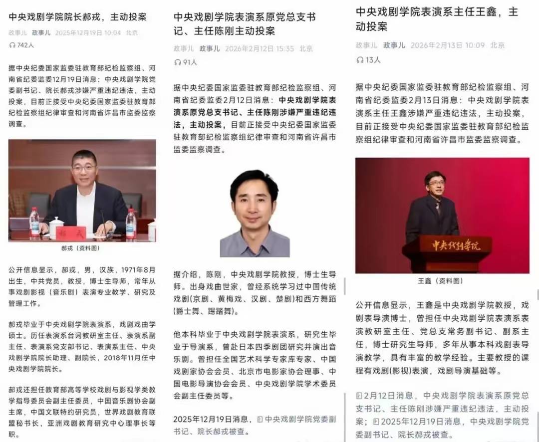 首先我们来看中戏投案的是哪三位,其一是郝戎、其二是陈刚、其三是王鑫。他们不仅都从中戏表演系毕业,还还曾在中戏身担要职。
