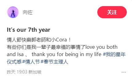 还发文:情人节快乐郭老师和小Cora,有你们是我一辈子最幸福的事情了,情人节表白老婆和女儿,一个大情人一个小情人,有了女儿之后的向佐更加柔软了,难怪很多人都说男生就应该有个女儿呢!