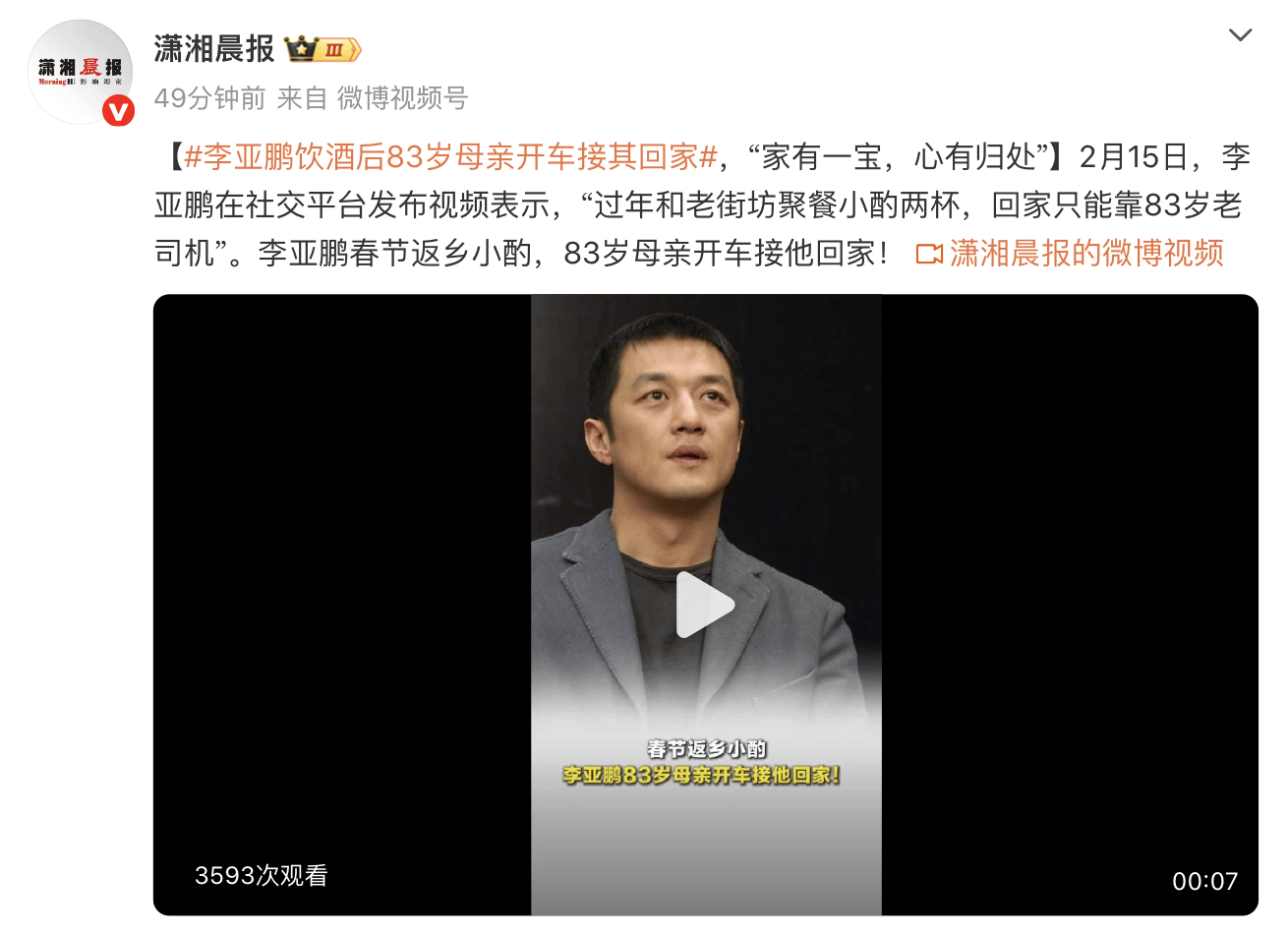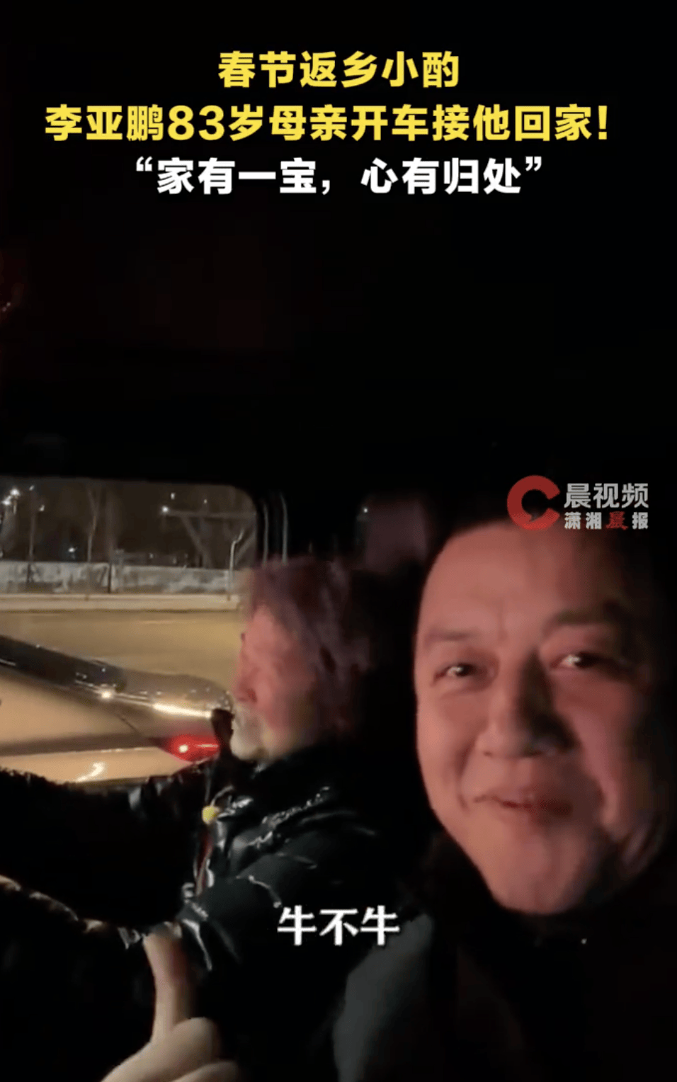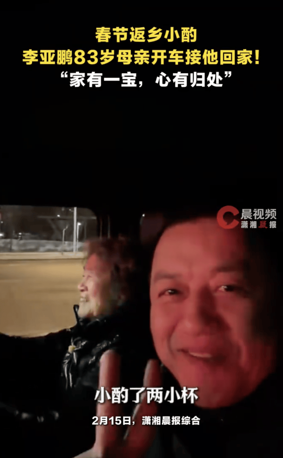 (来源:潇湘晨报)2月15日,李亚鹏在社交平台发布视频表示,“过年和老街坊聚餐小酌两杯,回家只能靠83岁老司机”。李亚鹏春节返乡小酌,83岁母亲开车接他回家!李亚鹏晒母亲接