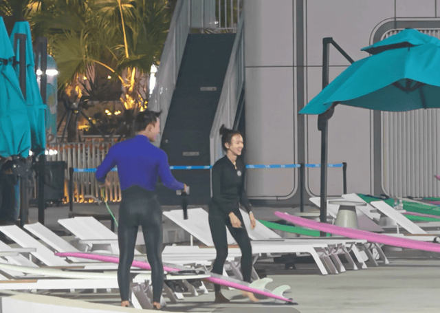 再看洪尧,他身穿一套紫色长袖紧身潜水服,搭配黑色长裤,一身穿搭凸显出良好的肌肉线条与运动体态。相比妻子,洪尧看起来并不是冲浪新手,手持白色冲浪板的他正从浅水区走向岸边,步伐稳健,周围溅起的水花,展现出刚完成冲浪活动的动态感。