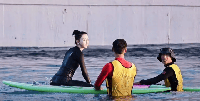 正在学习冲浪的吴谨言,盘起一头长发,只见她跪坐在浅绿色冲浪板上,双手自然撑在板面,姿态稳重,动作协调,显示出良好的平衡感与参与感。玩冲浪的吴谨言并没有化妆,而在自然光线下,她的皮肤状态显得光滑细腻,略带水珠与阳光反射,透出健康光泽,整体呈现出清新自然、充满活力的户外运动美感。