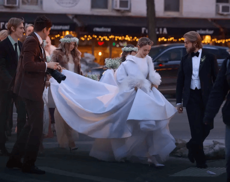 大婚当天的玛雅造型经典又灵动,她身穿一袭白色礼服长裙,披着一件羽毛质感的白色冬季大衣,新郎胡森则身着黑色礼服。