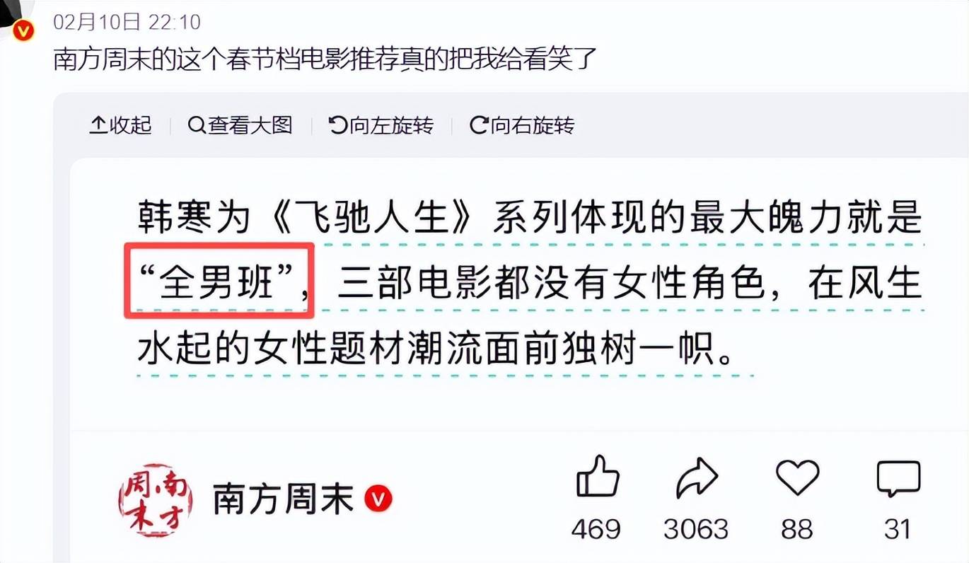 春节档预售大盘姗姗来迟的破亿,现在预售票房最高的不出意外就是《飞驰人生3》。这电影惹出的争议也不少,主流媒体的推荐都惹出了不少吐槽,多少有点不尊重女性,直接忽视女性观众