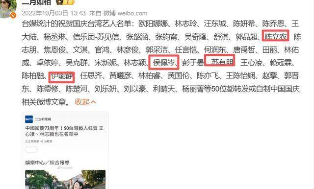 每次有转发任务的时候,他们都会被夸一次,像欧阳娜娜、侯佩岑不仅每次转发都不缺席,之前还被台文化部点名调查了,都没有让步。