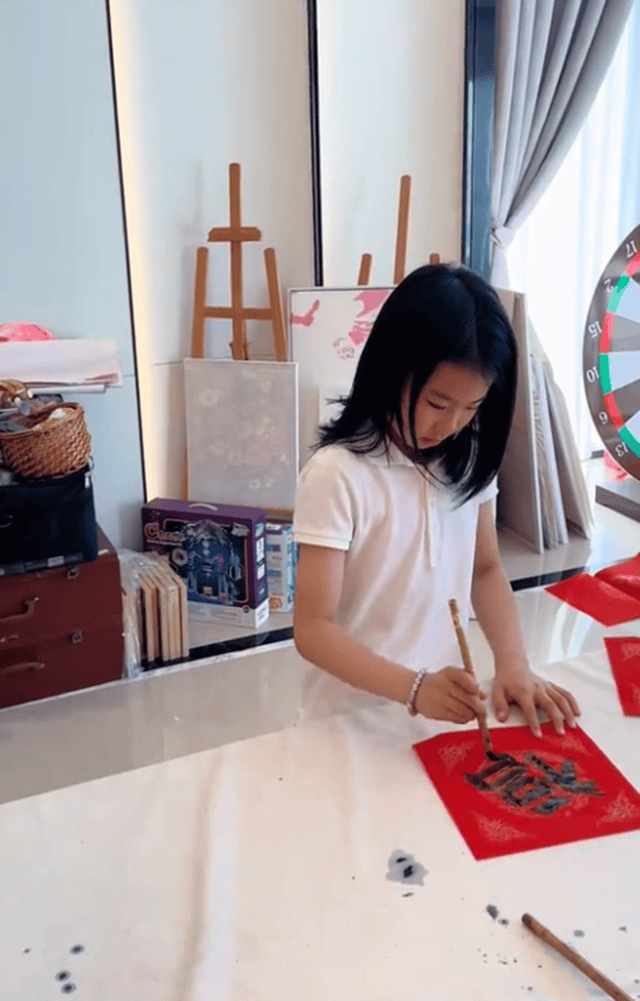 而在老公写得差不多的时候,王楠带着儿女贴窗花和对联。贴春联的王楠还特意换上了定制的T恤,大红T恤上印有一家四口合照。据悉,每年王楠都会为家人定制这样一件T恤,喜庆又有节日的仪式感。