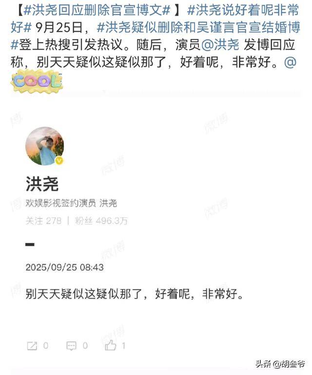 可就在传闻愈演愈烈的时候,洪尧火速发文辟谣,就简简单单七个字:“好着呢,非常好!”