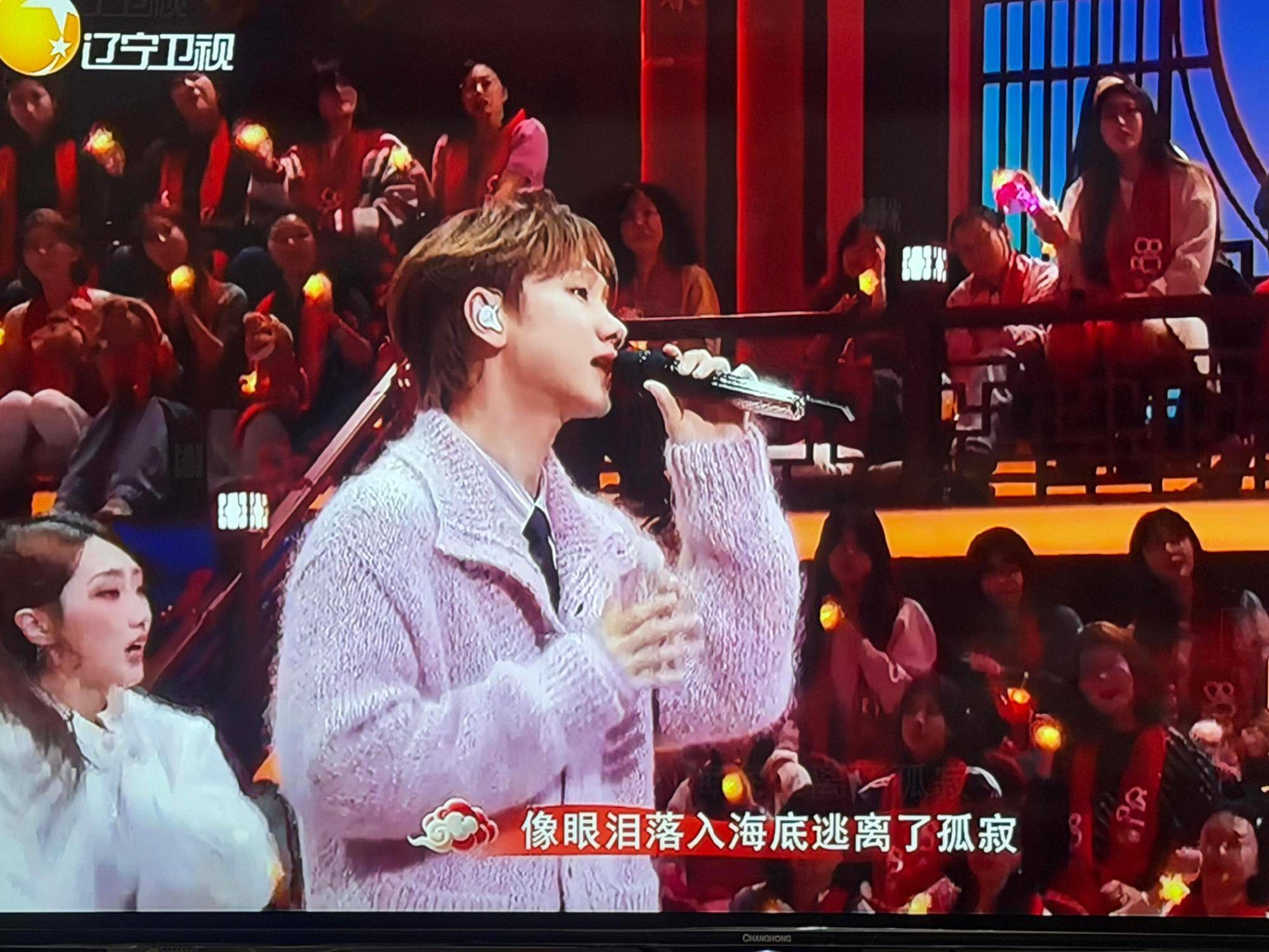 毛衣引发的热议,更深层地关联着汪苏泷与家乡的情感联结,作为土生土长的沈阳人,他深谙如何用细节唤醒集体记忆,舞台设计嵌入沈阳故宫琉璃瓦、奥体中心轮廓等标志性元素,LED屏幕动态呈现浑河晚渡的粼粼波光,而粉色毛衣上的星辰刺绣,恰似沈阳夜空中最亮的星,当他在演唱间隙用沈阳话唠嗑:“小时候在南湖公园滑冰车,现在给家乡银(人)拜年!”时,毛衣的温暖质感与乡音的亲切感交织,瞬间将舞台转化为大型“走亲戚”现场,粉丝们举着星星灯应援,母女、闺蜜组团打卡,这场演出早已超越普通晚会,成为游子与家乡的双向奔赴。