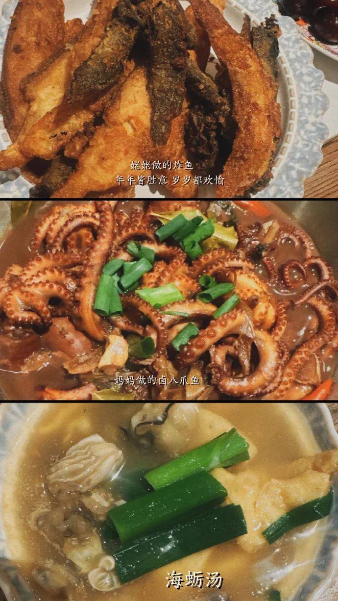 陈意涵晒出自己的新年总结,祝福大家“新的一年,都好”,还晒出了姥姥做的炸鱼和妈妈做的卤八爪鱼还有海蛎汤,看得出来陈意涵家很喜欢吃海鲜了。