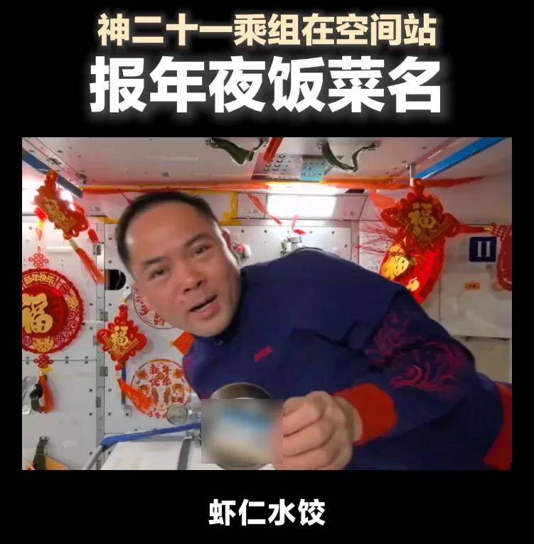远在空间站的神二十一乘组,也给全国人民发来了“来自太空的新年祝福”,还给大家来了一个报菜名,空间站的补给也很丰富,有水饺还有各种肉菜,现场布置也很吉庆,年味十足!