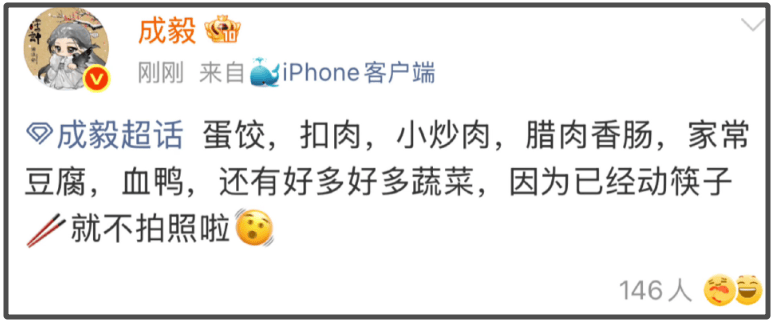 成毅空降粉丝超话和粉丝互动,可能是因为年夜饭太好吃了,成毅都没来得及拍照,只能以报菜名的形式和粉丝分享菜单。