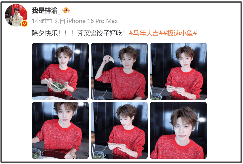 梓渝也晒出包饺子的照片,还发文说荠菜馅的饺子好吃。从和馅到包饺子,梓渝都全过程记录,穿着红毛衣,很有过年的气息。