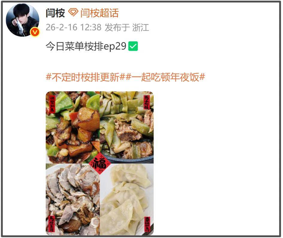 男星闫桉中午就晒出了年夜饭,有饺子,有豆角炖排骨,还有肉片,菜色很丰富。