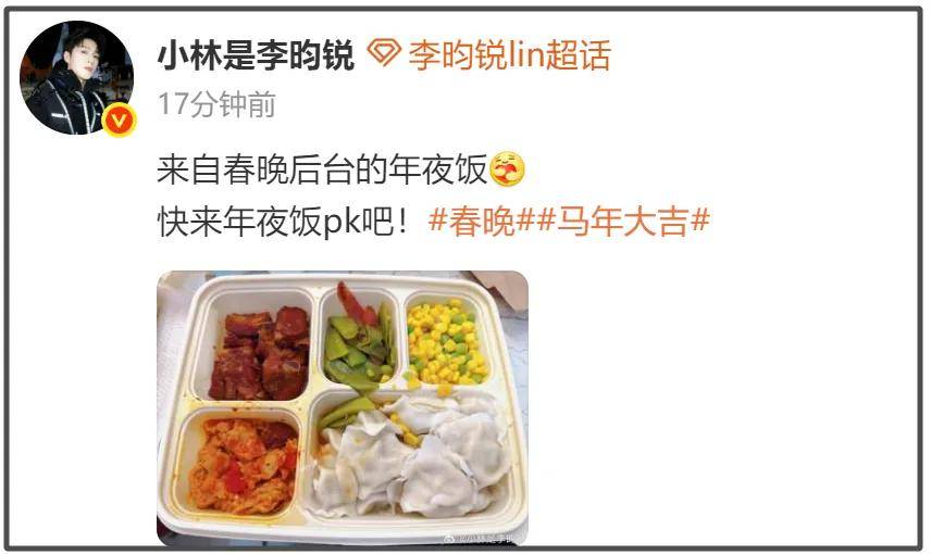 回到后台之后,也加入了明星晒年夜饭的大军,不过李昀锐晒出的是春晚盒饭。春晚节目组的盒饭菜色不错,四个菜荤素均衡,还有过节必不可少的饺子,很丰盛了。