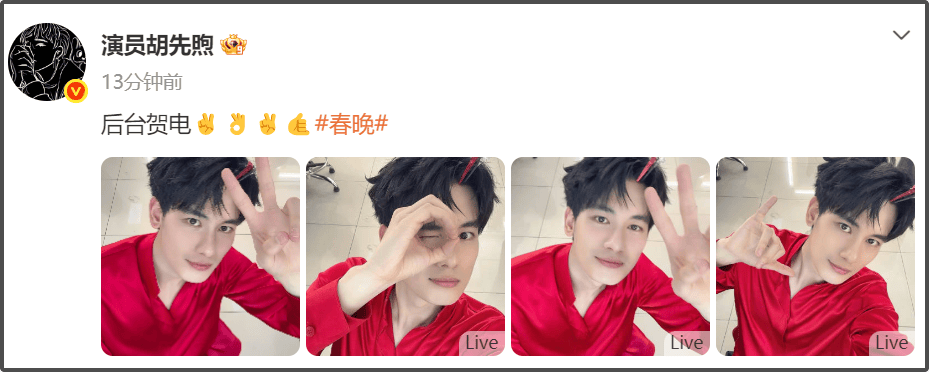 胡先煦也晒出自己在后台的自拍,配文“后台贺电”,摆出了“2026”的手势,来和观众一起过年。