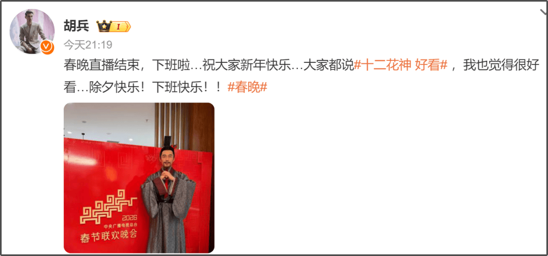 胡兵也晒出了下班后在春晚后台的照片,胡兵穿着十二花神的舞台服,拱手跟大家拜年。十二花神的节目因为舞美和特效获得了不少好评,胡兵的表演也很出色,评论区一片夸赞。