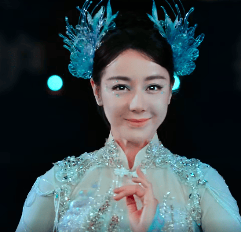 热巴的身材及面部状态都不算是她个人最佳。面部肉感明显,苹果肌、两腮、下巴都肉乎乎,浮肿感强。为了配合蓝色服装和头饰,妆容以蓝色为主,着重修饰眼睛,在眼周点缀了蓝色亮片,显得眼皮很肿,眉毛画得像“毛毛虫”,搭配上笑容变得很慈祥,多了一些土气。