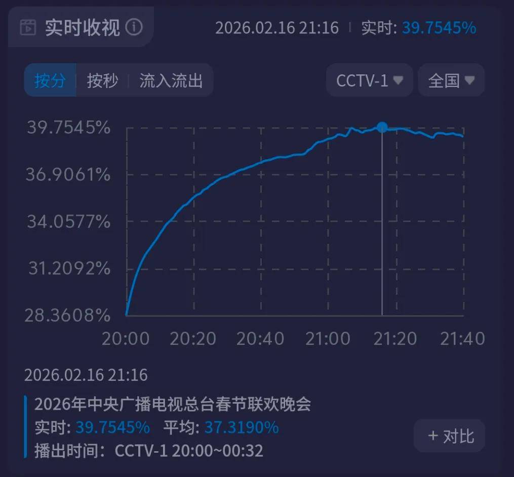 21:16,除夕晚上九点十六分,来个谐音“就要6”,马年春晚收视到达最高点,峰值为39.7545%,再次突破39%,又一次创下新高。