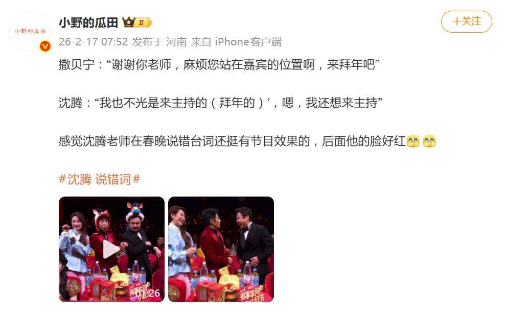 在多数观众看来,这次口误非但不扣分,反而给过于完美的春晚舞台增添了一抹真实的趣味和人情味。沈腾那一瞬间的紧张和脸红,与他一贯的松弛喜剧形象形成了微妙反差,让失误显得格外真实可爱。不少人评价道:“这失误经沈腾一转化,本身就是个现挂的笑点”、“看惯了零失误,这种小插曲反而让人记住了,这才是活人直播的魅力”。