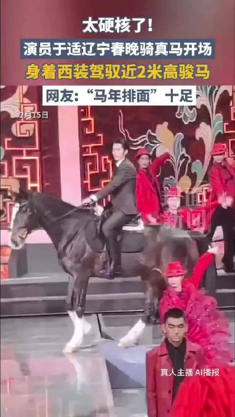 2026年辽宁卫视春晚舞台上,曾主演《封神》《镖人》的著名演员于适身骑一匹近2米高的德国温血马惊艳亮相,成为国内春晚历史上首位在演播厅内骑真马登台的艺人。
