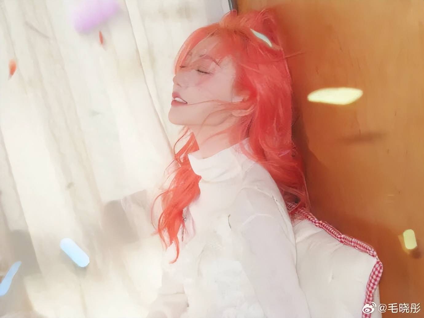 毛晓彤背靠垫子和柜子,她俏脸清丽脱俗,染红的长发飘逸,唇红齿白很撩人,这位女星闭目养神的样子很可爱!