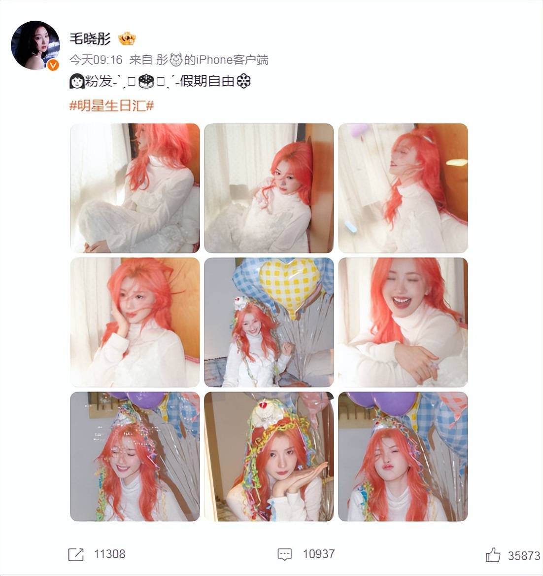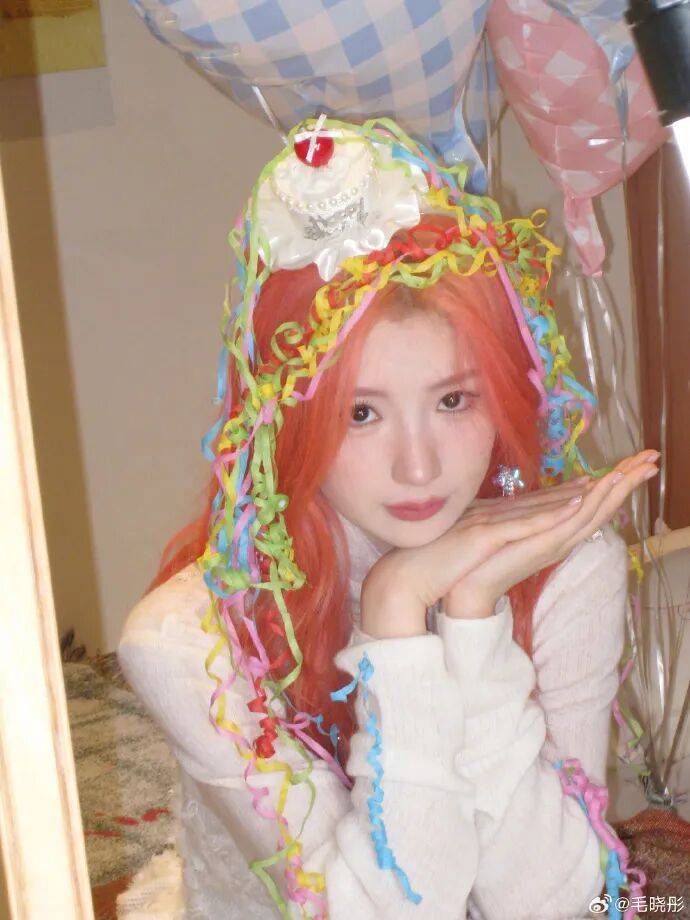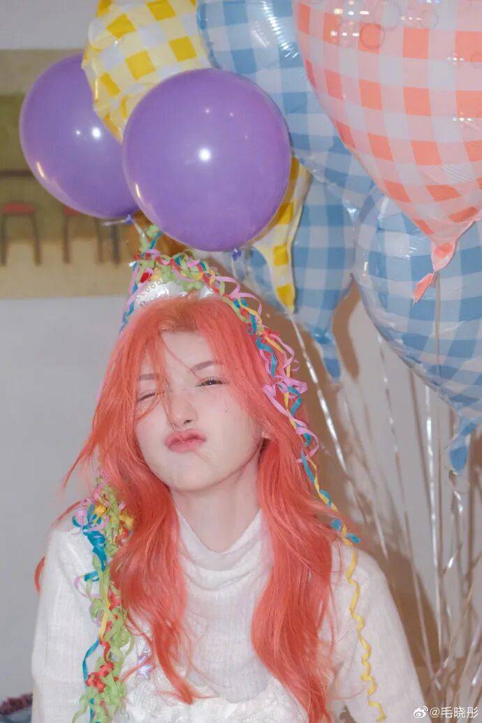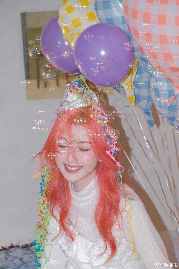 毛晓彤一头亮眼的粉发,搭配彩色丝带和气球,她做出嘟嘴wink、托腮笑等表情,这位女星的每个动作都带着明媚活力,美得让人窒息。
