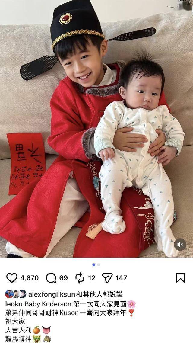 古巨基首度公开二胎儿子Kuderson的照片,大儿子抱着小儿子,五官都随了父亲。