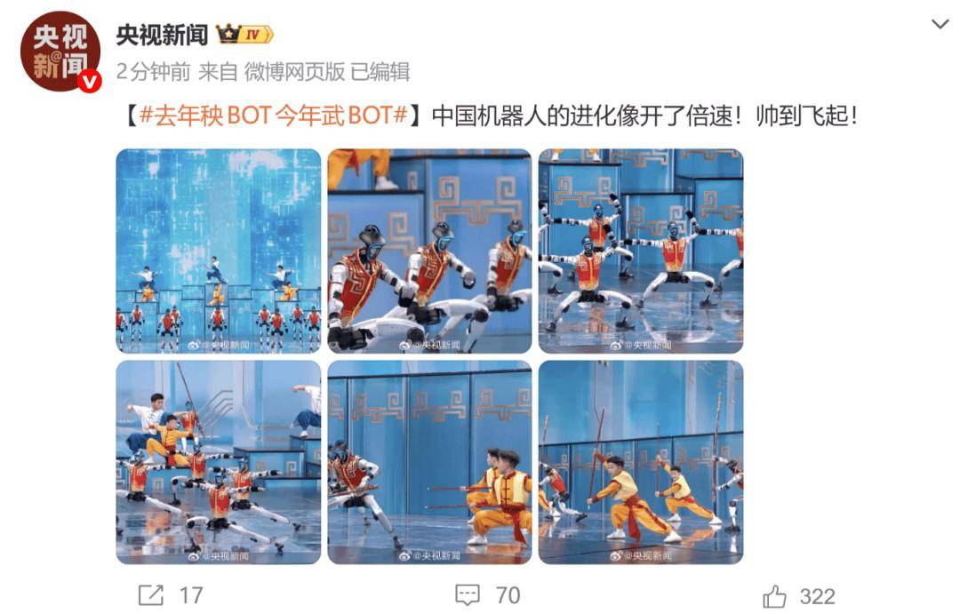 2月16日,宇树科技机器人亮相央视春晚,表演武术节目。中国机器人的进化像开了倍速,从去年的扭秧歌到今年的武术,帅到飞起!
