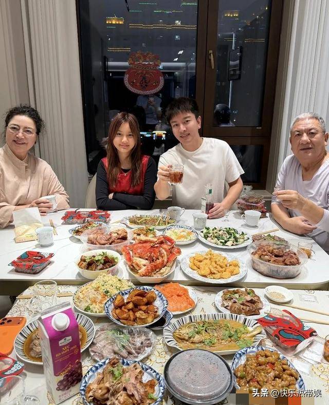 2月16日晚间,贾乃亮更新社交媒体动态,晒出与父母还有女儿甜馨的同框照片,一家四口时隔多年再次同框,画面很是温馨。餐桌上菜品丰富,帝王蟹,炸肉段,还有鸡腿,牛肉等等。贾乃亮还有他