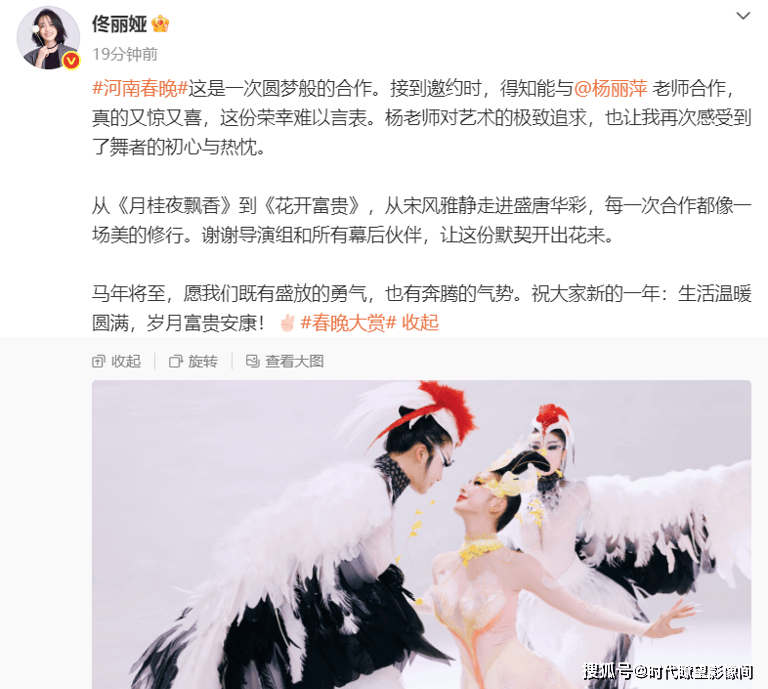 佟丽娅在文中直言,此次河南春晚之行,是一场“圆梦般的合作”:“接到邀约时,得知能与杨丽萍老师合作,真的又惊又喜,这份荣幸难以言表。杨老师对艺术的极致追求,也让我再次感受到了舞者的初心与热忱。”她还回顾了与河南卫视的不解之缘,从《月桂夜飘香》的宋风雅静,到此次《花开富贵》的盛唐华彩,每一次合作都像是一场美的修行,同时她也暖心致谢导演组和所有幕后伙伴,直言是大家的默契,让这场国风盛宴得以完美呈现。恰逢马年将至,佟丽娅也送上新春祝福,愿所有人“既有盛放的勇气,也有奔腾的气势”,祝大家生活温暖圆满,岁月富贵安康,温柔又有力量,贴合马年奋进向上的氛围。