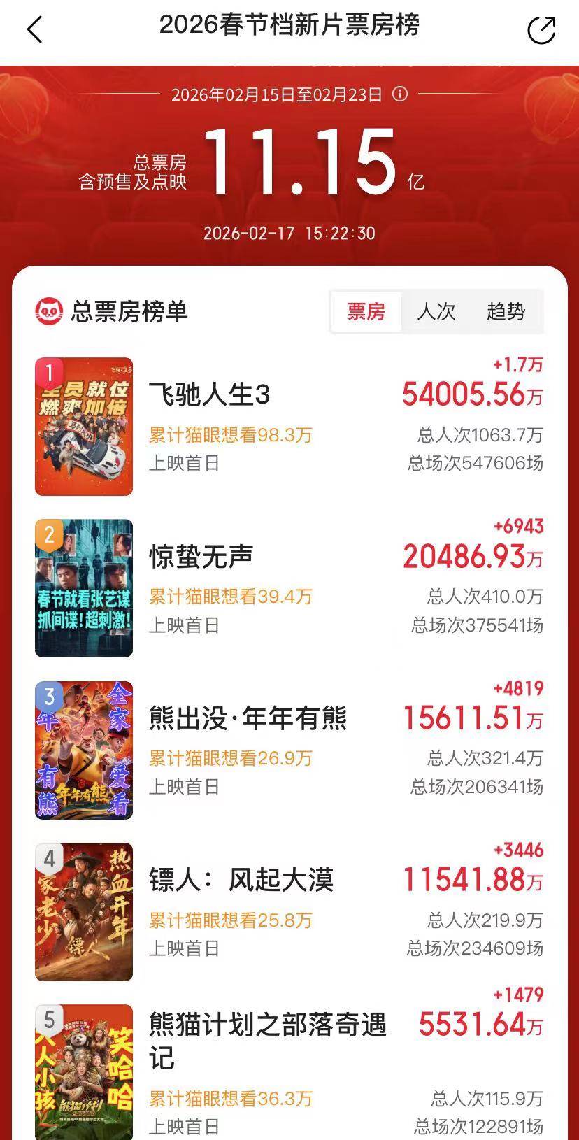 影片自预售阶段便展现出压倒性优势,截至2月16日,预售总票房已突破3亿元,占春节档总预售票房近半,稳居榜首。大年初一单日票房达5.2亿元,首日累计票房已超4.8亿元,远超同档期其他影片。