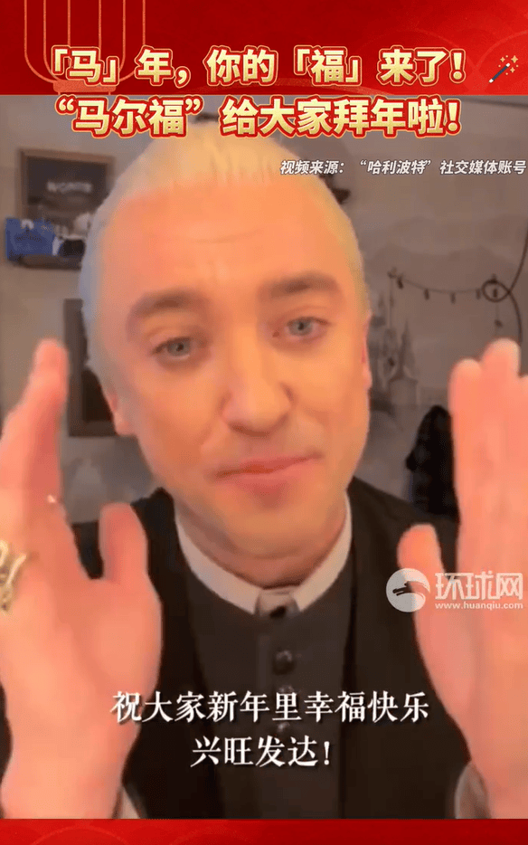 近期,变身中国“不可思议的新年吉祥物”的英国奇幻小说《哈利·波特》的反派人物马尔福火出圈。2月17日大年初一,哈利·波特官方账号在中文社交媒体上发表视频,并配文:“马”年,你的“福”来了!“马尔福”给大家拜年啦!“哈利波特”电影系列主演汤姆·费尔顿送来马年新春祝福!