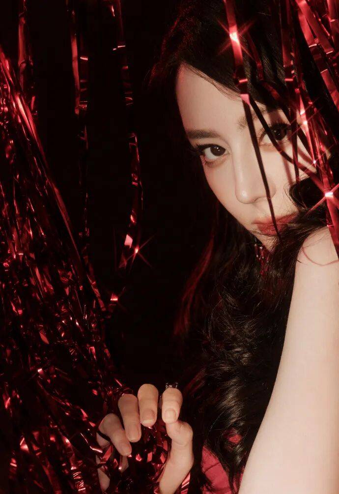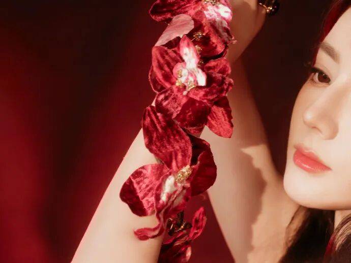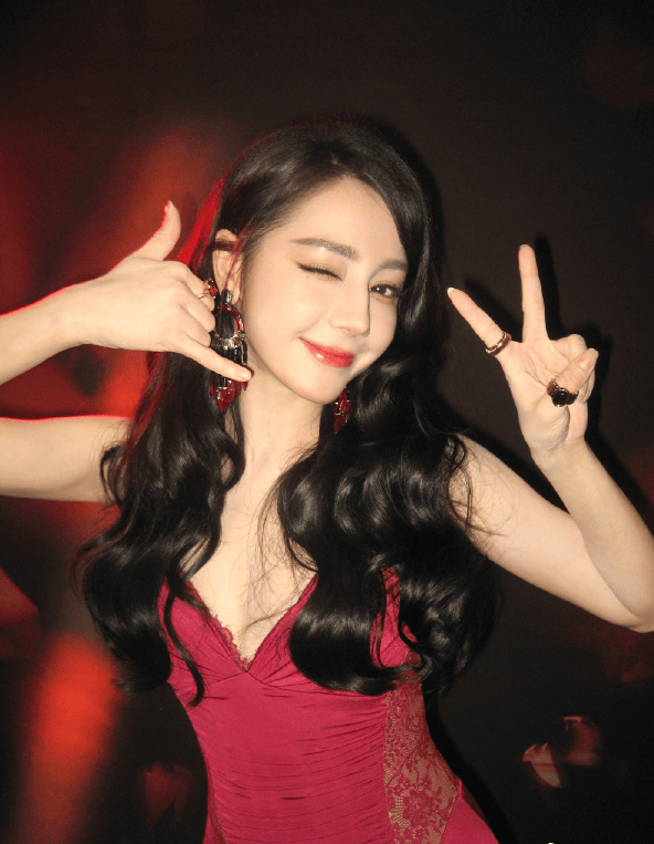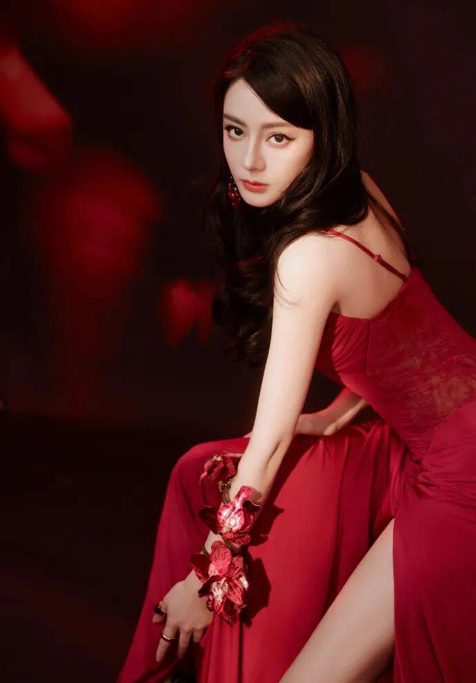 迪丽热巴穿着红色长裙,她异域风情的俏脸,精致的五官,复古的烈焰红唇,她高举双手,露出事业线和修长的大美腿,曼妙的身材曲线,绝对性感撩人!