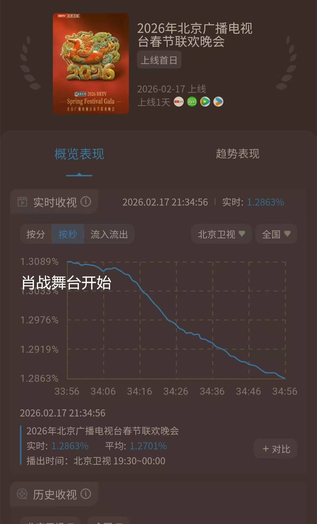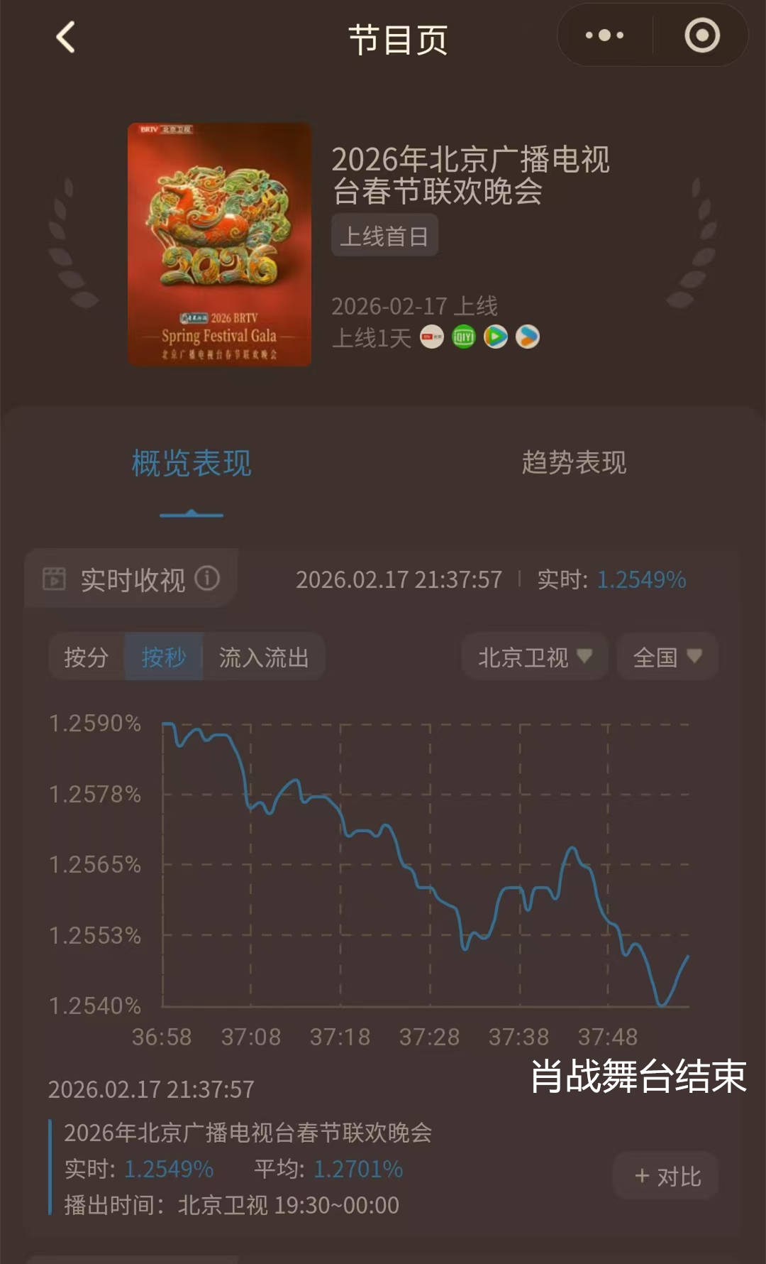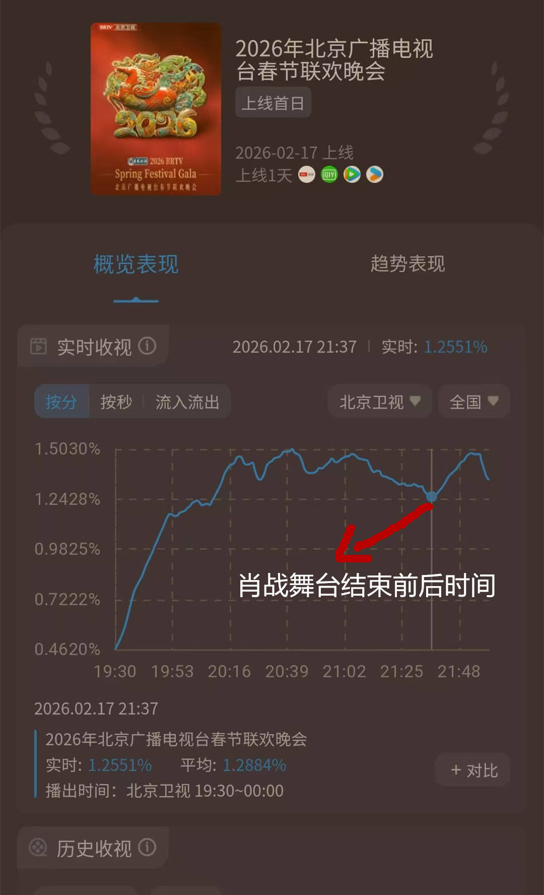 大年初一,多家卫视播出春晚内容。北京台春晚,无疑是万众瞩目的,呈现到酷云实时的收视率上,也是各家领跑的状态。当然,1.5%前后的峰值收视率,和辽视春晚的4%起步,还是有一些差距的。而北京卫视春晚当中,出现了一个非常值得注意的数据现象,流量明星肖战的《岁岁年年》安排在了当晚9点33分。这无疑是一个春晚的黄金时间。然而,肖战登台之后,北京卫视的实时收视率,直线下滑。