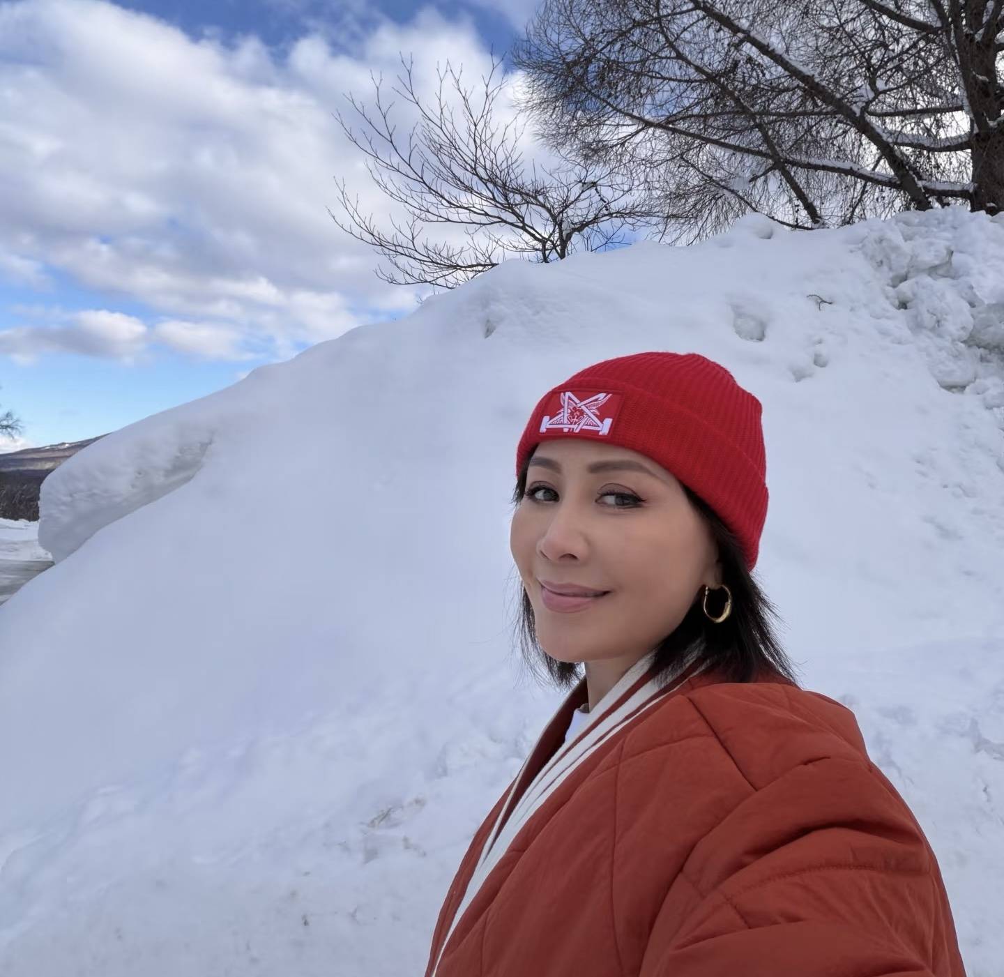 背后是洁白的雪景,还有碧蓝的天空,刘嘉玲对着镜头自拍。