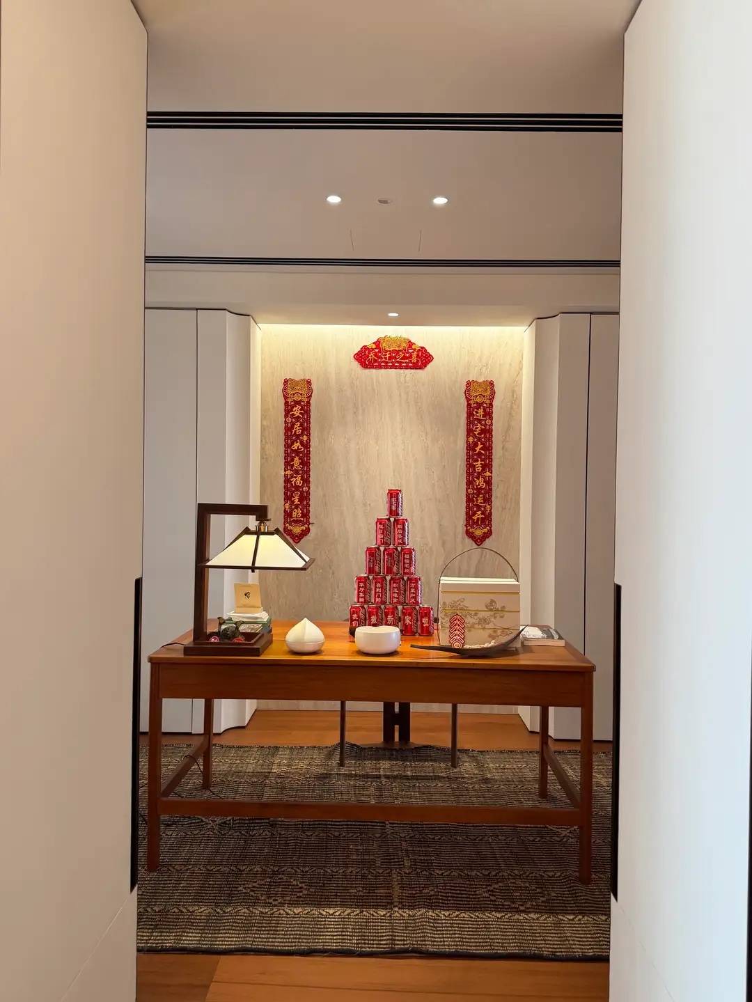 房间里的每一个角落,都特别有设计感。在桌面上摆满了红包、凤梨、花生,这些带着美好寓意的东西。