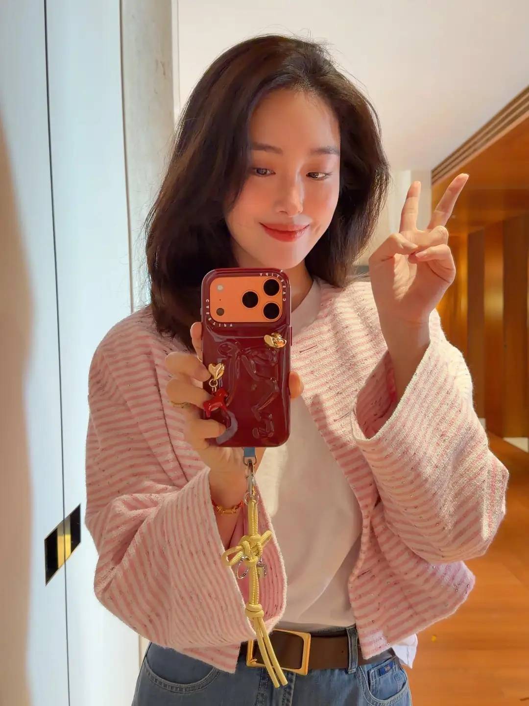 照片中杨采钰穿一件粉色条纹小外套,搭配了浅蓝色的高腰牛仔裤,面色绯红带着一点很娇羞的美,这个模样也非常讨长辈喜欢。