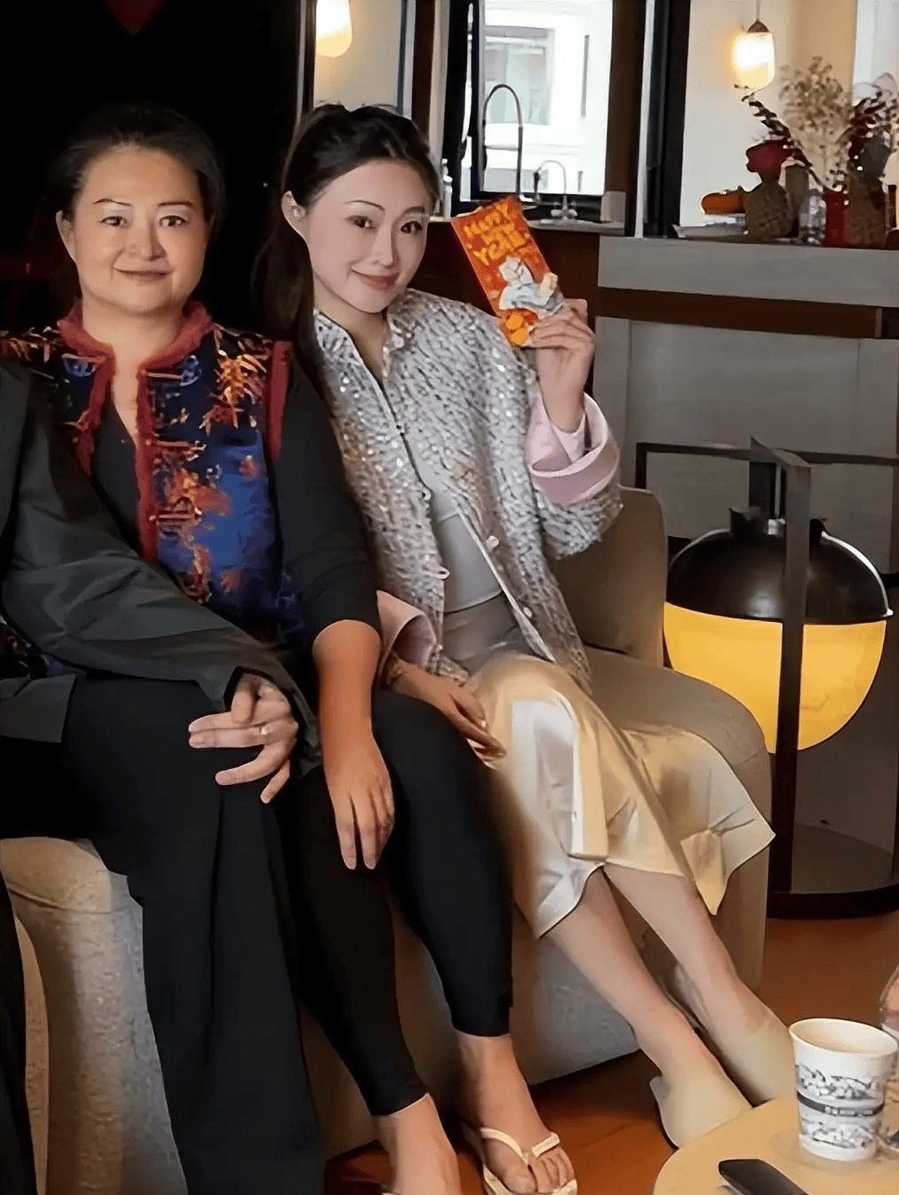 这组照片是杨采钰小姑子发出来的,小姑子和婆婆紧挨着坐,她挽起了头发、穿一件新中式的国风上衣,气质特别好。手里的红包应该也是杨采钰婆婆给的,上面写着happy new year!