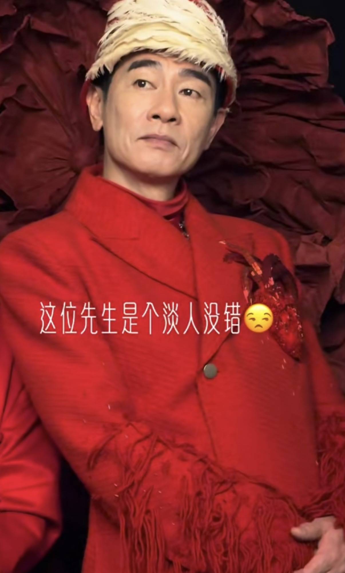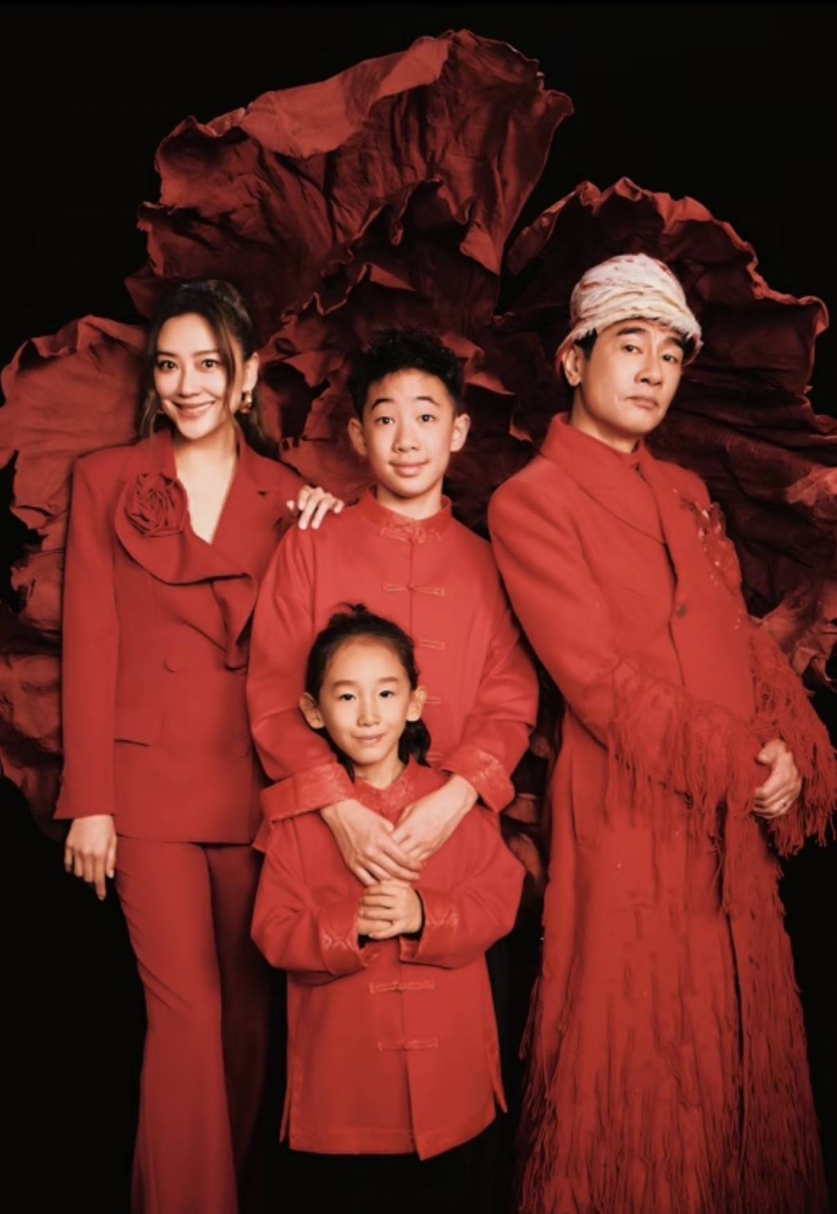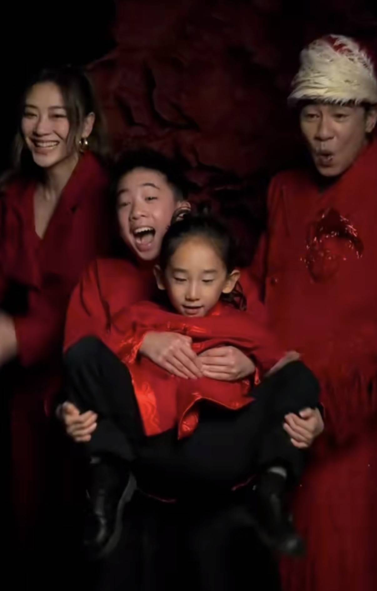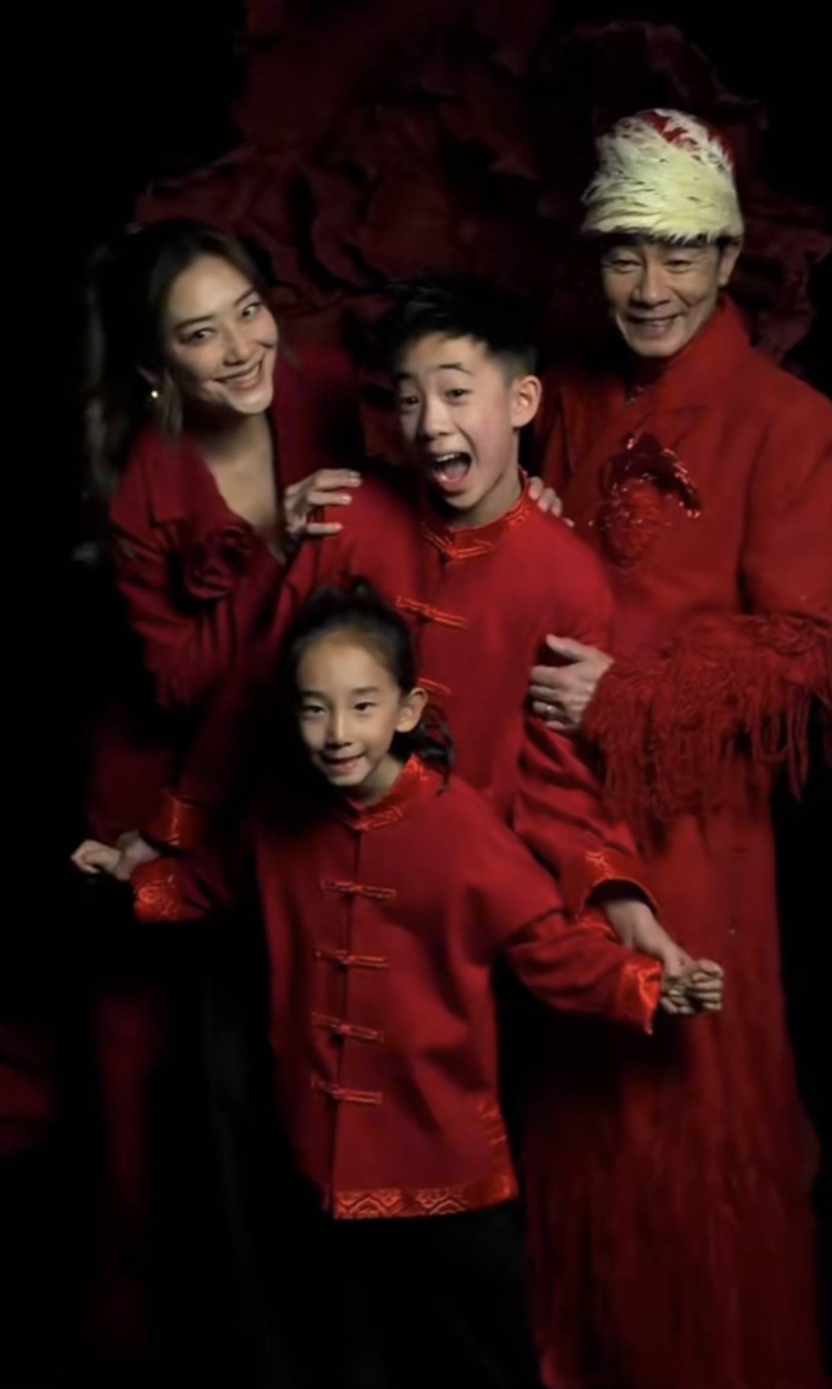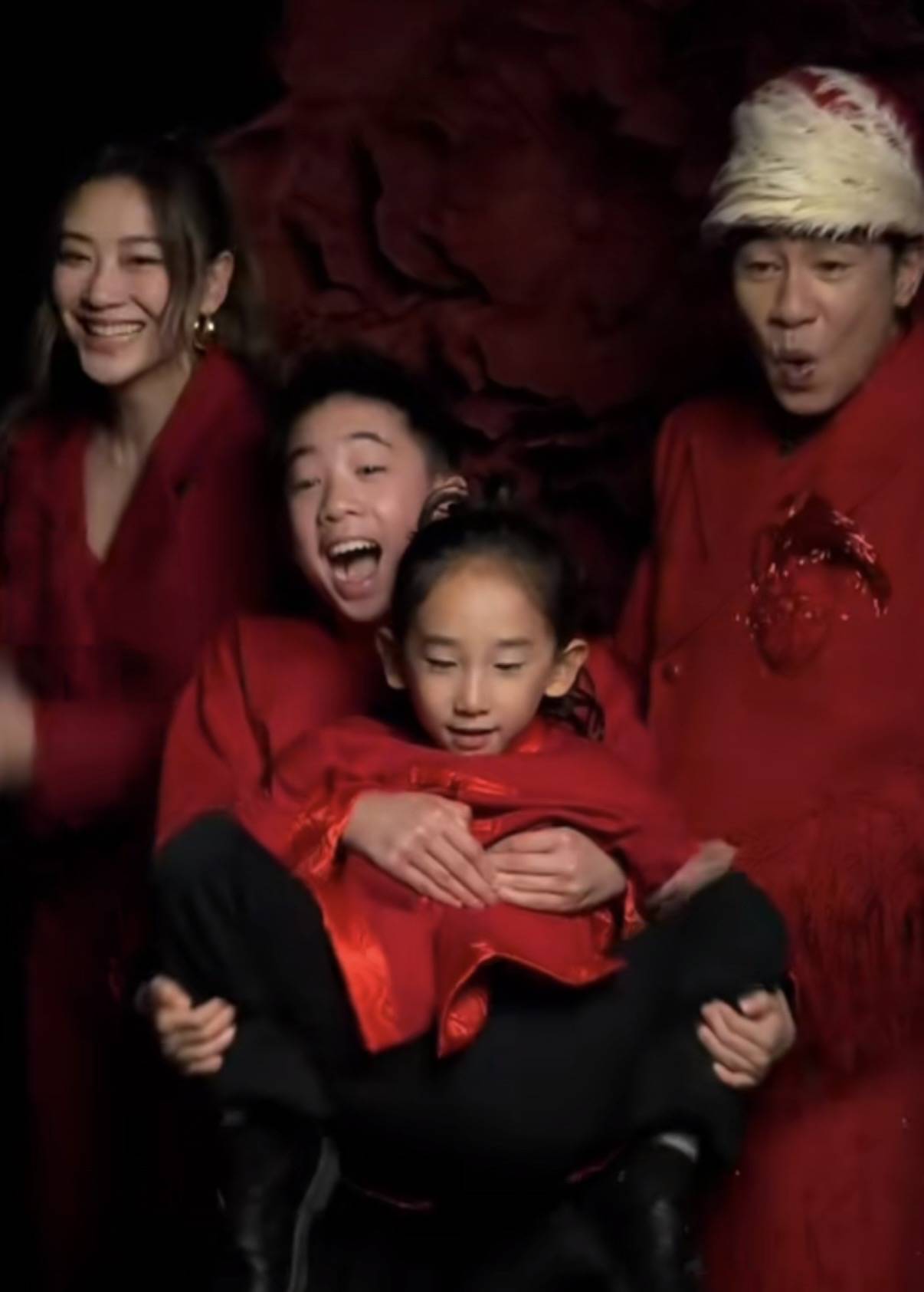 陈小春流苏款的舞台妆,带着民族风的帽子。这是在大年初一登台表演的造型,一家四口亮相时也都穿红色衣服。