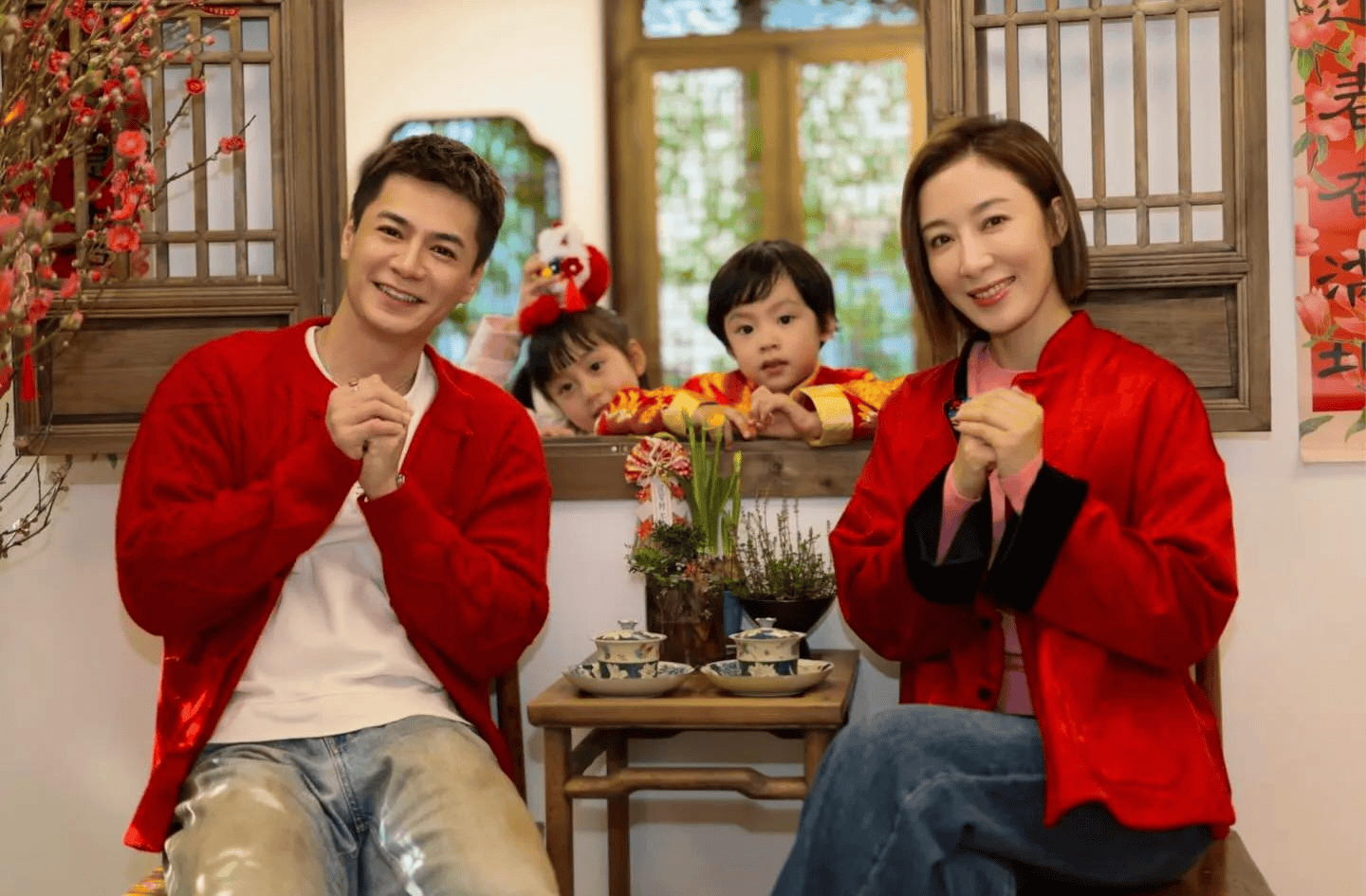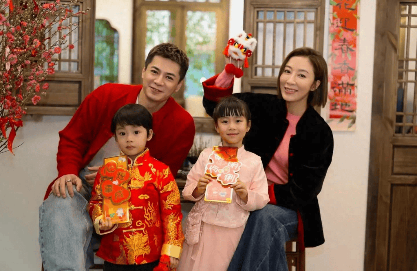 在这张照片中,杨怡选择了黑色的传统服装搭配牛仔裤,显得既有节日的氛围又不失随意感;罗仲谦则穿着一件红色针织上衣,同样配上牛仔裤,整体风格简洁又协调。夫妻二人穿着相配,宛如自然流露的默契,让画面更加协调。而他们的孩子们也没让人失望,女儿身着粉嫩的新中式裙装,显得天真可爱;儿子则是身穿红色唐装,样子活泼有精神。两人的穿着都与节日气氛紧密结合,整体画面融洽,令人感受到一家人节日团聚的温暖。
