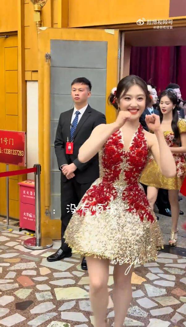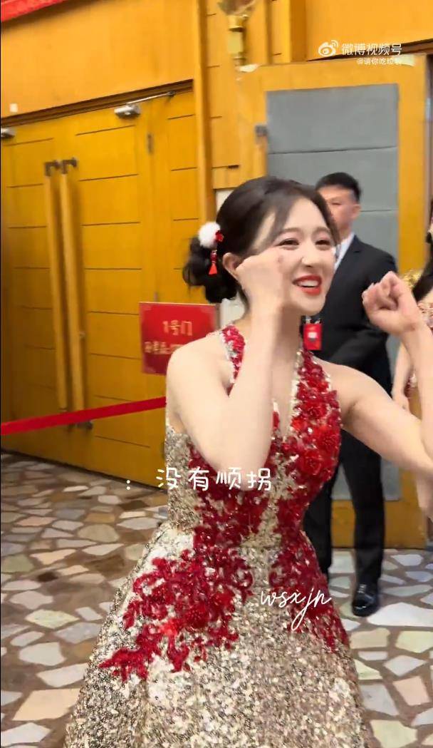 然而,自嘲归自嘲,舞台上的李兰迪可是交出了一份满分答卷。一袭红色蓬蓬裙配上俏皮双丸子头,活脱脱一个“人间福娃”。从开场站定到《难忘今宵》旋律响起,她全程动作流畅、精准到位,甜美的笑容和稳定的发挥被观众盛赞为“甜度爆表的年画娃娃”,与后台那个担心“顺拐”的她形成鲜明对比。