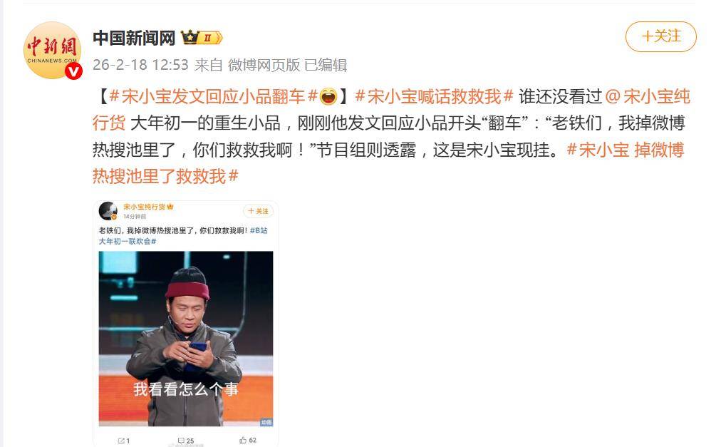 2月18日,宋小宝在微博上@宋小宝纯行货,将这场“事故营销”推向了高潮。他发文写道:“老铁们,我掉微博热搜池里了,你们救救我啊!”,巧妙地将舞台上黑暗中等候的尴尬场景,与当下热搜话题双关绑定,自嘲拉满。节目组随后证实,这波微博互动也是即兴创作的延续。果然,话题#宋小宝 掉微博热搜池里了救救我#迅速冲上热搜榜,网友纷纷在评论区调侃:“挂着吧不用救了”、“你自己游上来吧,热搜池水暖和”。