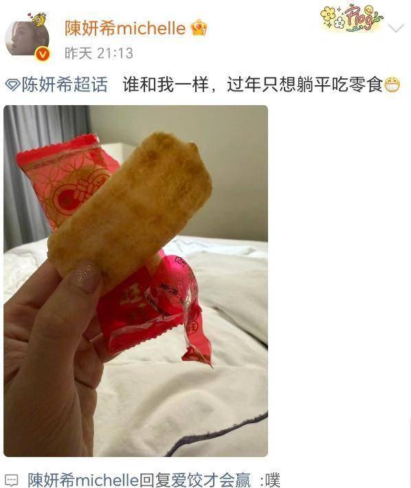 陈妍希今年过年的状态也格外好,除夕这天,她晒出营业照,调侃自己只想躺着吃零食,仍然还是一副可爱小女生的样子。